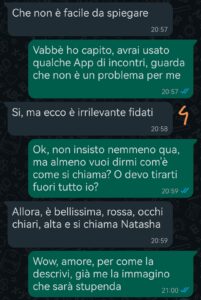 Ero felice, anche se mille dubbi mi tormentavano: dove l’aveva conosciuta, visto che non esce mai? Com’era possibile che all’improvviso si sentisse così sicuro? Ho cercato di non indagare troppo, almeno finché non mi ha mostrato una foto. Era splendida, non c’era altro da dire. Ma ovviamente, come ho iniziato a fare delle osservazioni, lui ha fatto un gesto che mi ha tolto ogni certezza. È stato allora che ho capito: dietro quella ragazza si nascondeva molto più di quanto avrei mai potuto immaginare.”