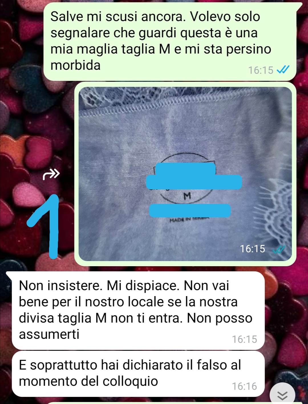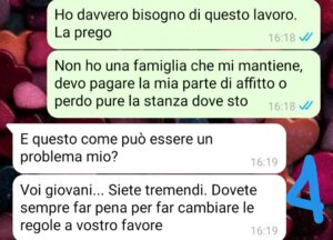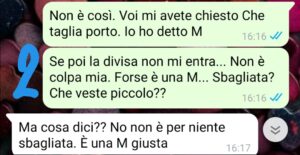 Alla fine del colloquio mi dicono che dovrò indossare una divisa e mi chiedono che taglia porto. Rispondo una M. Che è sempre stata la mia taglia. La domanda mi fa strano ma penso sia per prendermi la divisa e lo vedo come un buon segno. Infatti mi dicono che mi faranno fare 2 giorni di prova. Io vado, ma accade un piccolo inconveniente…la prova però me la fanno fare lo stesso e va bene. Nonostante questo non mi assumono e volete sapere la motivazione assurda??? Leggete la chat…ora secondo voi cosa posso fare io?