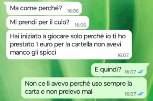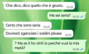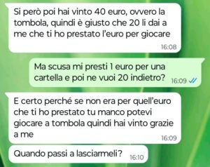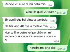 “Ciao Spunte Blu sono una donna di 32 anni e sto per mandarvi una conversazione spiazzante. La conversazione è tra me e una mia cugina. Questa cugina si chiama Elena e direi che ormai posso definirla a pieno titolo una vera strozzina. C’è da dire che lei è sempre stata una piuttosto spilorcia e sempre molto attenta ai soldi, ma questa volta ha toccato proprio il fondo rivelandosi una persona davvero vergognosa. Ieri sera abbiamo giocato tutti a tombola in famiglia, eravamo circa 18 persone tra zii e parenti vari. Io alle prime due tirate non ho giocato, ho partecipato solo all’ultima tombola che hanno fatto chiedendo a questa mia cugina 1 euro in prestito per comprare 1 cartella (ero senza spicci perché pagando sempre e solo con la carta mi capita raramente di prelevare quindi non ho quasi mai contanti con me), alla fine ho fatto tombola vincendo 40 euro. Oggi questa mia cugina mi scrive e leggete cosa pretenderebbe dalla mia vincita, arrivando perfino a ricattarmi su una questione mia personale molto molto delicata. Vi rendete conto? Quando si dice parenti serpenti è proprio vero.”