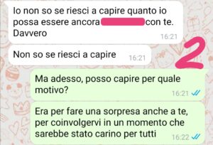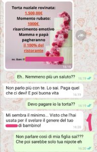 Ci sono rimasta molto male per la sua reazione già durante il matrimonio. Ma mai immaginavo che sarebbe arrivata a non parlarmi addirittura più e soprattutto che avrebbe poi fatto ciò che ha fatto…mandandomi questo primo messaggio che poi ha scatenato tutto! Io sono senza parole, si può arrivare a fare una cosa simile??? Davvero??! Non so come sanare la situazione ma sono certa di non volerlo fare come chiede lei! Sbaglio io??”