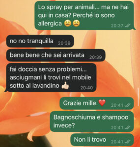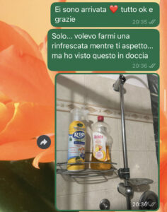 Entro, mi tolgo la giacca, mi guardo un po’ intorno. A un certo punto penso: “ok, nel frattempo mi faccio una doccia al volo così mi rinfresco”. Apro la tenda della doccia, guardo i prodotti appoggiati… e lì. Lì ho fatto una scoperta atroce. Non vi dico altro, ma vi giuro che ho avuto un momento di gelo totale.