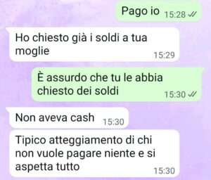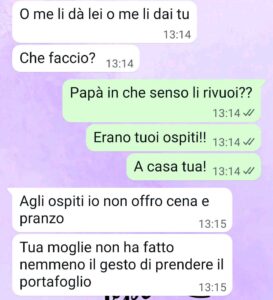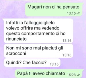 Vi mando la chat perché non si fa così. se veniamo a farti compagnia, il minimo che ci aspettiamo è ospitalità, potere consumare dei pasti senza il pensiero di mettere subito mano al portafoglio .. insomma essere una famiglia…”