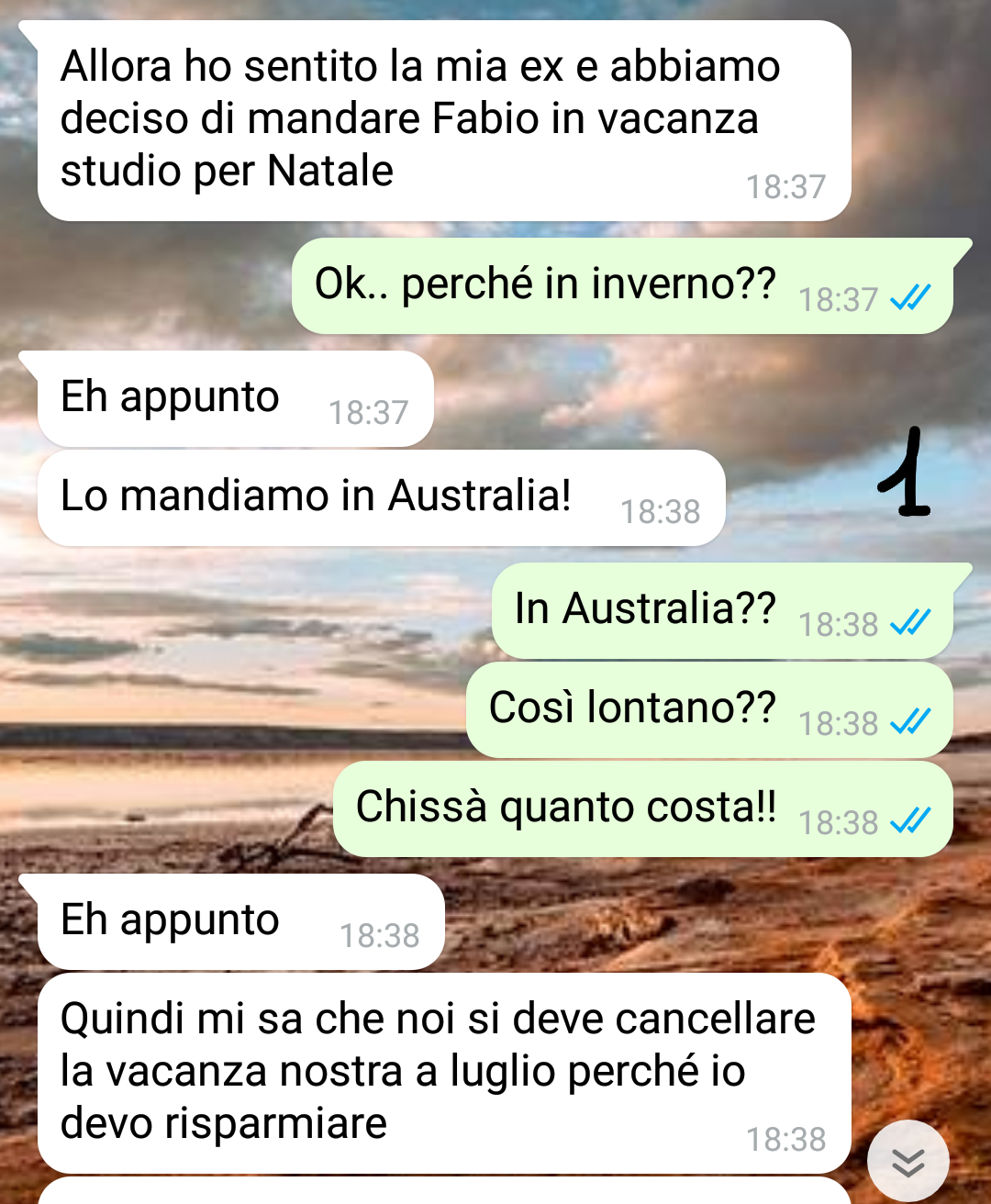 “Ciao SpunteBlu, mi chiamo Mara e vivo da 5 anni con Fabrizio. Fabrizio è divorziato: dal suo primo matrimonio ha avuto un figlio che si chiama Fabio e che oggi ha 19 anni. Fabio viene a trovare molto raramente suo padre: una volta stava da noi un week end si e uno no, ma poi con il tempo le sue visite sono diminuite e oggi è raro che venga a trovare il padre più di una volta al mese… A Fabrizio la situazione va bene così dato che non ha e non ha mai avuto tutta sta voglia di fare il padre. Purtroppo per compensare questa cosa ha sempre riempito Fabio di regali più o meno costosi… certamente questo non ha fatto bene al ragazzo – viziare i figli non è mai un bene – ma soprattutto non ha fatto bene al conto in banca! Tra consolle appena uscite e vestiti griffati sono stati migliaia gli euro buttati via negli anni… e la situazione non fa che peggiorare con il tempo!! Ora noi dovremmo sposarci a breve e io inizio a vedere questo sperpero non semplicemente come una sua follia, ma come un danno al mio di conto in banca, dato che in un certo senso dovrò contribuire anche io!! Fabrizio dice che esagero e che alla fine si tratta di spese necessarie che non può non fare per suo figlio.. e certo alcune sono anche spese necessarie ma altre no! Ad esempio la vacanza studio in Australia a me pare davvero eccessiva…”