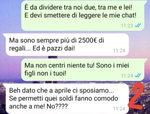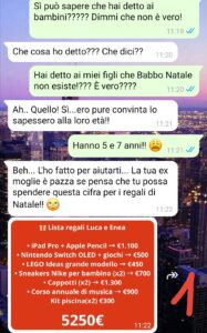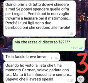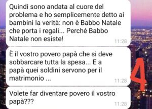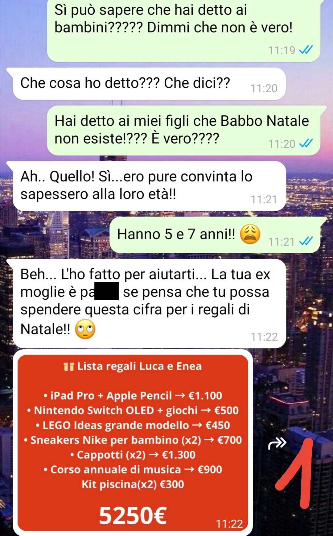Qualche settimana prima di Natale, come facciamo ormai da un paio d’anni a questa parte, la mia ex compagna mi manda una lista con i regali di Natale da fare ai bimbi…quest’anno la mia fidanzata ha intercettato la lista guardando il mio whatsapp.