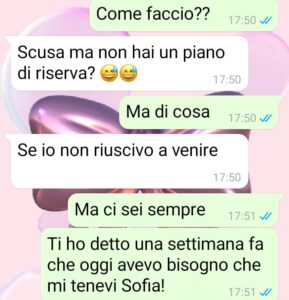 A quanto parte Alessia non è d’accordo e me l’ha dimostrato venerdì, quando avevo davvero bisogno che mi guardasse mia figlia, per permettermi di andare a un appuntamento, una volta tanto che riesco a conciliare LAVORO – CASA – FIGLIA – VITA PRIVATA.
