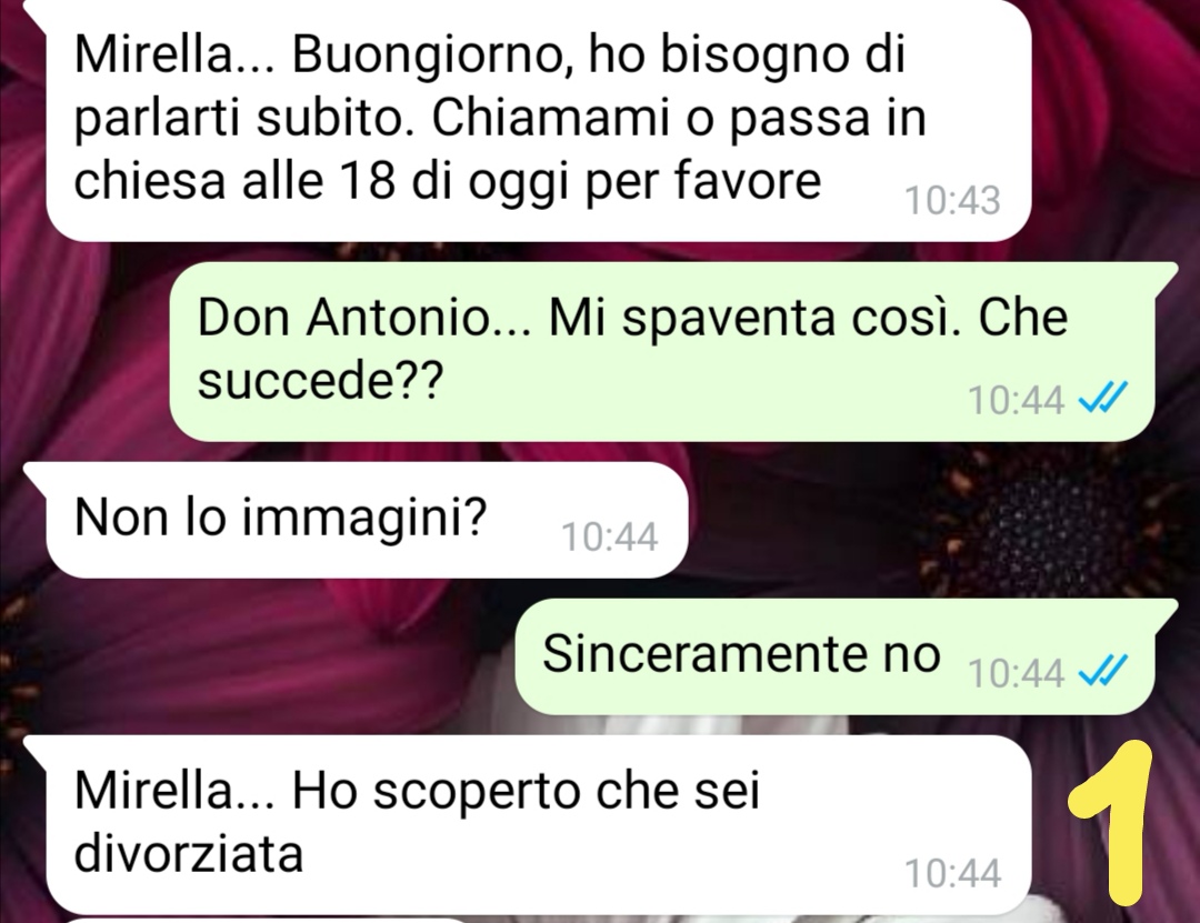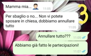 Mi sono immaginata ogni dettaglio, vestito compreso. Anzi soprattutto il vestito…che diciamocelo per una sposa è la cosa più importante. Poi abbiamo scelto la chiesa, del posto in cui ora viviamo. Abbiamo iniziato gli incontri pre matrimoniali ecc…poi un giorno il Don della chiesa mi scrive un messaggio e mi dice che mi deve assolutamente parlare.
