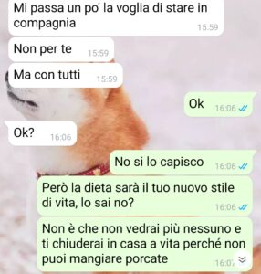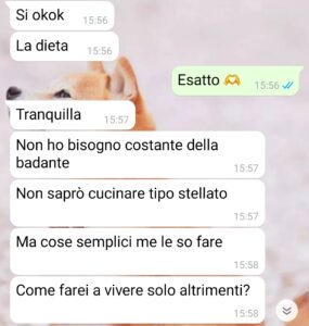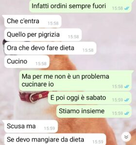 “Ciao, sono Martina e sto con Riccardo. So di sembrare la cattiva della storia, quella che è dalla parte del torto, ma credo che quando ami qualcuno e vuoi starci, diventi anche un po’ rompina per farlo stare meglio. E lui ha tanto bisogno di stare meglio perché è, diciamo sovrappeso, e non voglio che il mio ragazzo stia male. Penso che tutti debbano mettersi a dieta, anzi non si dovrebbe nemmeno dire stare a dieta, ma dovrebbe essere la nostra corretta alimentazione e invece la si vede come una punizione, come qualcosa di strano, se non ti strafoghi allora sei strano, se non mangi pizza e schifezze sei strano, ma non è così. Comunque scusate questo pippone, ma ci tengo molto a questo argomento e sto cercando di farlo capire anche a lui che ne ha tanto bisogno. Di contro, Riccardo si è comportato molto male con me perché, a testa sua anche se non è vero, gli sto troppo addosso e gli do fastidio perché voglio che dimagrisca e inizia, così a dire cattiverie e arrampicarsi sugli specchi, finché ho preso una decisione drastica sulla nostra relazione.”