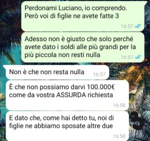 Ma non immaginate cosa è successo da quel momento. Una vera guerra interna perché i genitori della Ludo hanno detto che i soldi sono finiti per i matrimoni delle prime due figlie e che a noi non toccava praticamente niente.