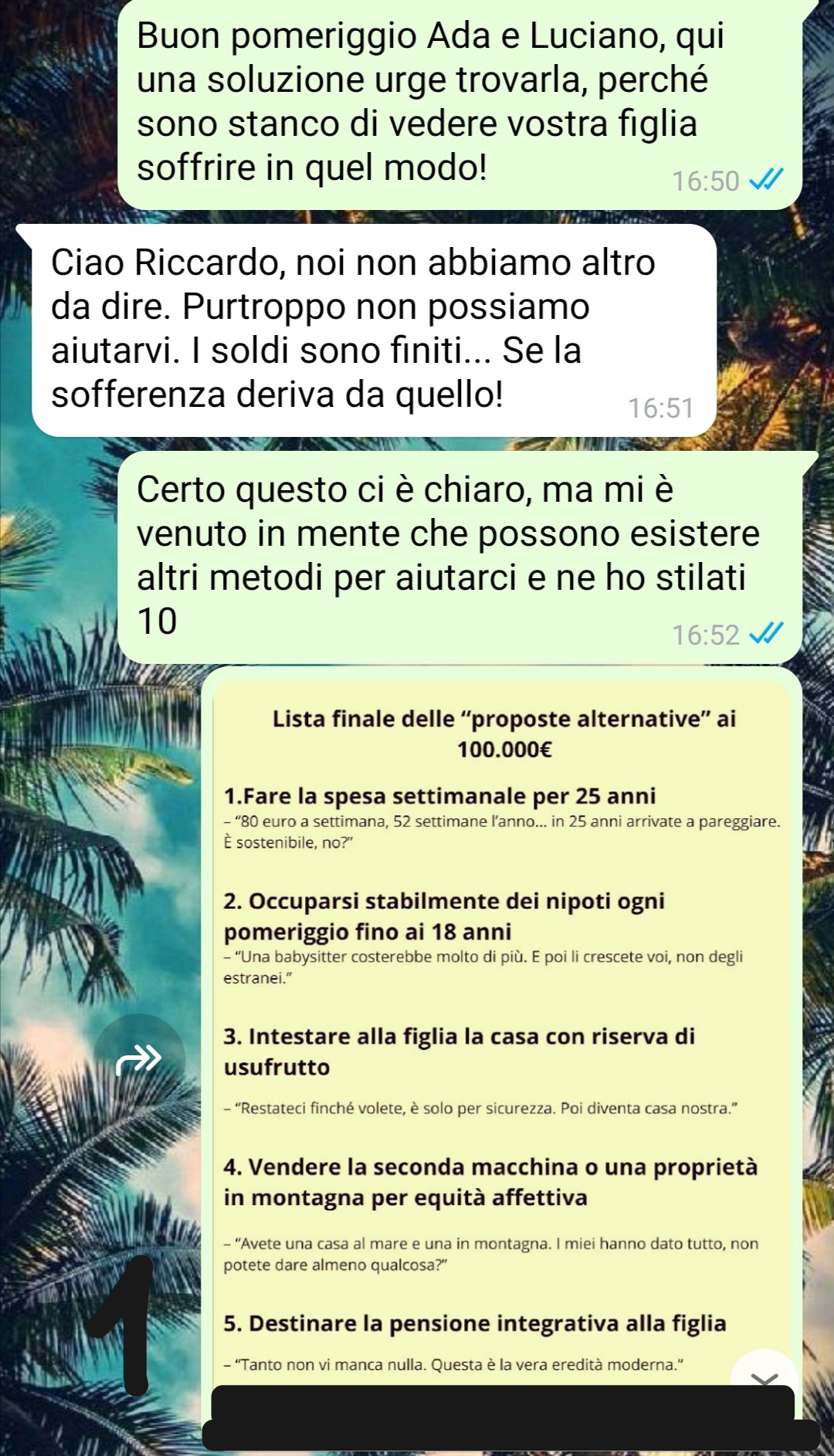 Così per provare ad aiutarla ho stilato una controproposta alternativa per i miei suoceri… ma guardate la loro risposta.