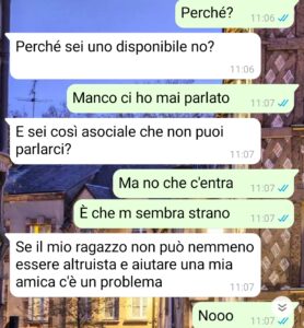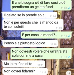 “Sono Nicolò e mi reputo un ragazzo molto timido, dai sani valori e principi e assolutamente fedele. Per questo ho sempre difficoltà con le persone gelose perché non si può trovare uno più fedele di me, anzi nemmeno i cani sono così fedeli, io sono uno di quelli che quando si innamora o si fidanza, la mia metà è il centro delle mie attenzioni, mi interessa solo di lei e ho occhi solo per lei e penso che così debba essere sempre e per sempre. Con tutti i prescindere, ma per me è una cosa assoluta. Un’altra categoria di persone che a me non piacciono sono quelle che ci provano con persone che sono chiaramente impegnate. Mi è capitato di vedere dei ragazzi che ci provassero spudoratamente e in modo anche piuttosto insistente e pesante con delle ragazze che si sapeva avevano il ragazzo, ma la loro politica era che se la ragazza cedeva alle avances allora peggio per il fidanzato che magari in quel momento non c’era. Non amo nemmeno strane abitudini a letto con e senza il partner, per questo quando la mia ragazza mi ha detto che aveva bisogno di un aiuto su una cosa strana io non ero molto d’accordo.”