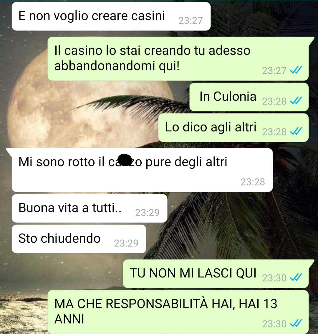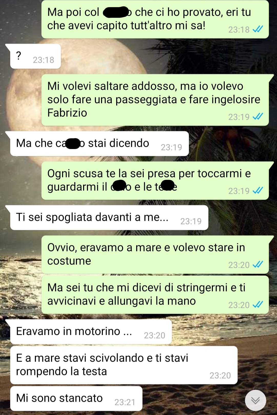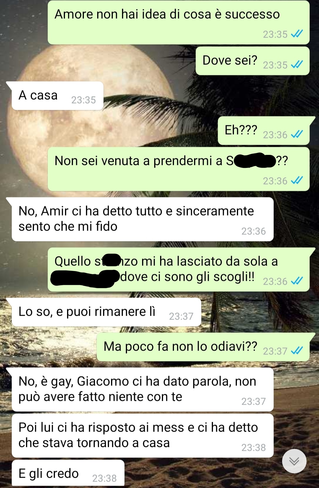 “Capito lo schifo? Vatti a fidare dei ragazzi, uno ti rovina l’unica serata tra voi due, l’altro ti abbandona dopo che ha capito che tu non ci stai.. ma c’era un’altra cosa strana., in teoria Fabrizio doveva già scrivermi di non avermi trovato nell’altro posto…”