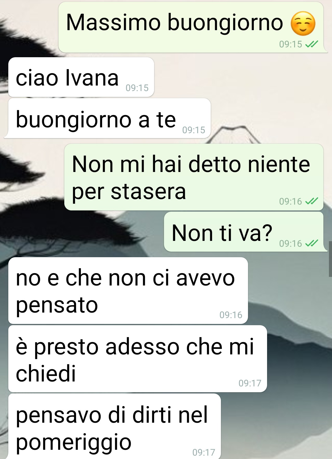 Pagina di spunte blu buongiorno a tutti, sono Ivana e da un mesetto ho iniziato a frequentare questo Massimo. Mi piace, come io piaccio a lui. Uscite, aperitivi, serate, tutto bello, tutto fantastico. Mi sono innamorata, credo. Anche lui è cotto a puntino. I tempi per un bacio sono maturi eccome. Me ne rendo conto, e lo vorrei anche io. Ma sono costretta a ritrarmi quando lui ci prova. Non per essere bastarda e fare la difficile, o perché non voglio. Ma ho un piccolo problemino con un batterio, una stupidata in fondo, ed essendo molto zelante e rispettosa (troppo) ho voluto tutelarlo. Ovvio che lui non sa, ma quando ha preso male il mio continuo rifiuto ho dovuto spiegare le cose. È quello che succede in questa chat tra me e lui, ieri mattina. Vi dico solo che le premesse erano buone. Ma i risvolti poi sono andati decisamente lontani da ogni mia aspettativa.”