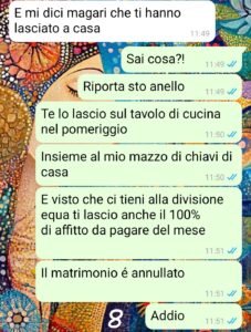 Leggi le ultime storie L’anello a rate Ti sposo a determinate condizioni Il colloquio accompagnato Complicarsi la vita Mio figlio si trucca Matrimonio in rosa Il profilo della merceria La mensa della scuola Lo smalto blu Pregi e difetti La recensione Lavatrici e trasferte La testimone di nozze La mia ragazza Il mio compleanno Sono figli tuoi Test del DNA Il rimborso emotivo Conto corrente sentimentale Rimborso nozze saltate