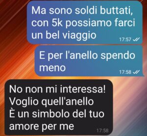 Ho provato a spiegare che i sentimenti non si misurano in carati, ma la sua ossessione per lo status symbol l’ha resa furiosa, liquidando i miei messaggi con un laconico “voglio l’anello”. Ho temuto che i nostri cinque anni finissero per cinquemila euro di vanità….”
