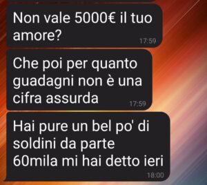 Mi ha chiesto un anello di fidanzamento da 5k!!! Io non sono uno a cui mancano i soldi (FINO A OGGI). Ho un lavoro e una casa mia e questo mi permette di risparmiare molto e di avere soldi in più per passarmi qualche sfizio. Ok, ma non sono d’accordo con gli sprechi! E lei ora si era veramente impuntata con sta cosa dell’ anello d 5 mila euro. È stata lunica cosa a cui ho detto no, vi giuro. E non è per i soldi . per me era solo per lo spreco di denaro in un oggetto inutilmente costoso.