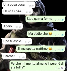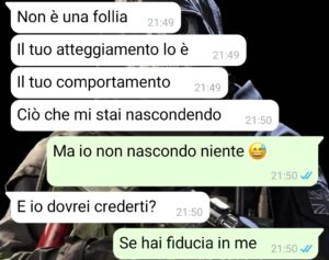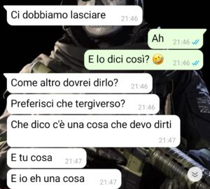 “Salve a tutti, mi chiamo Matteo e la mia ragazza si chiama Alice e, probabilmente, per la prima volta in assoluto nella storia di Spunteblu a mandare la chat sono entrambe le persone di comune accordo. Infatti la mia ragazza è proprio accanto a me e ha voluto lei che facessi questa cosa, per dimostrare la mia malafede e per sapere da voi se è normale ciò che è successo. Su questo ultimo punto io mi accodo, perché non penso che il suo di atteggiamento sia molto normale, io non ho fatto niente, ma lei non è dello stesso avviso. Ai posteri l’ardua sentenza, o in questo caso a voi. Quello che dovreste sapere di noi è che stiamo insieme da 7 mesi e lei ha avuto qualche episodio di gelosia, ma certo mai fino a questo punto. So che sembra una frase clichè, ma è veramente così. Di contro io sono un tipo estremamente tranquillo, permissivo e libero, se ci dovessimo lasciare così sia, non sono un tipo che sclera e si strappa i capelli e cose del genere, evidentemente non dovevamo stare insieme, per questo anche ho reagito così nella chat, ma vi lascio alla vostra lettura e a quello che, secondo lei, avrei fatto di sbagliato.”