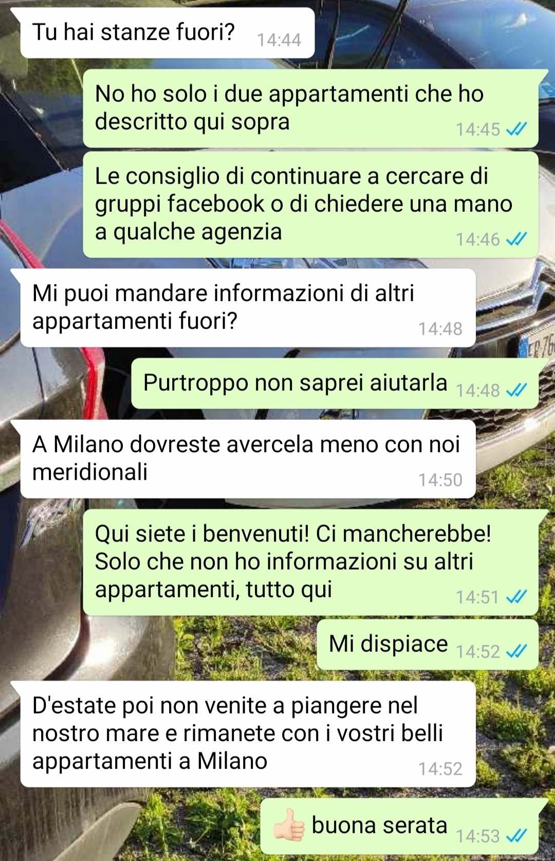 Premetto che in passato mi è capitato anche di peggio e ho ricevuto vari insulti, ma ho deciso di inviarvi i discorsi con questo signore perché di punto in bianco comincia a parlare a caso delle persone “del Nord”… E ci terrei che questi pregiudizi finissero. Ditemi voi cosa ne pensate.”