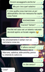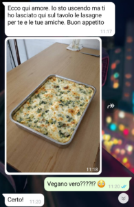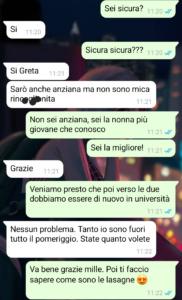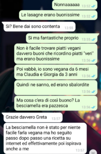“Mi chiamo Greta e oltre ad avere una mamma molto giovane ho anche una nonna molto, molto giovane. Lei ha avuto mia madre che era poco più di una ragazzina, e poi mia mamma uguale con me. E voi dire: “Ma che fortuna che hai una nonna così giovane, te la puoi godere di più”. No. Non è una fortuna. A parte che essere nata da una famiglia di questo tipo mi imbarazza, ma vabbè, non entro in dinamiche famigliari troppo private. Ma in ogni caso, una nonna così giovane è come avere una seconda mamma. E anche qui tutti grideranno al miracolo ma no, una seconda mamma non è un vantaggio, è una rovina, perché tutti gli aspetti negativi si moltiplicano per due. Ma non voglio essere presa in antipatia. Qui sono io la vittima e per questo ho diffuso questa chat. Da sei mesi circa sono vegana molto convinta (e vorrei anche vedere!) e avevo invitato a pranzo a casa di mia nonna due ragazze appena conosciute, anche loro vegane, a cui tengo molto. Avevo chiesto a mia nonna una sola singola cosa: farmi una teglia di lasagne vegane per questo pranzo. Fine. Non vi dico, è stato un giorno terribile.”