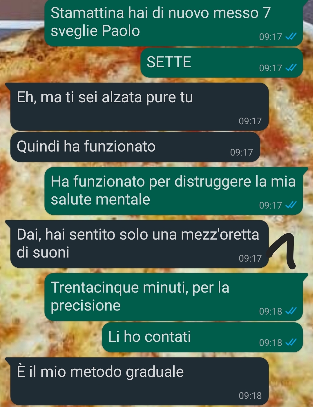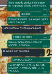 E io lì, immobile, a chiedermi se l’amore sopravviva anche alla privazione di sonno. Quando finalmente mi addormento, scatta il concerto delle sveglie: sette allarmi, sette colpi al cuore. Così stamattina, con le occhiaie che urlavano vendetta, ho deciso che era il momento di farglielo capire. Con calma, con amore e sicuramente un pizzico di creatività. Perché se la guerra delle sveglie deve continuare, almeno che vinca la più silenziosa, perdonatemi non ce la faccio più.”