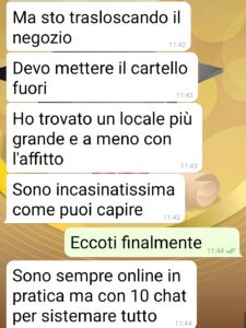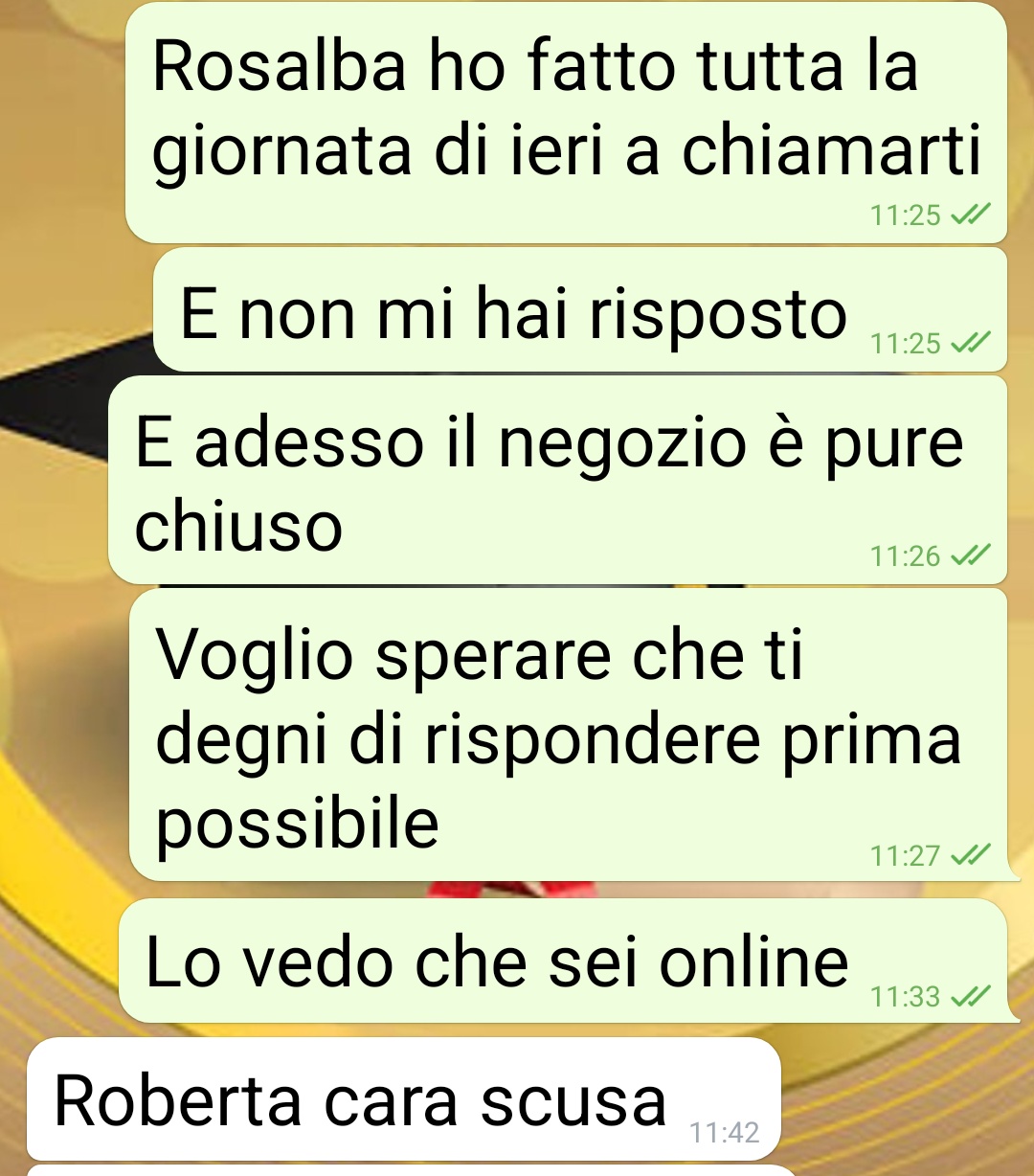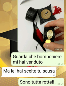 Ciao pagina di spunte blu, io sono Roberta e finalmente sono arrivata alla tanta agognata laurea. Ci ho messo qualche fuori corso di troppo ma ormai è fatta. Ma il giorno dei festeggiamenti arriva il travaso di bile: le bomboniere sono orribili, tutte difettose e a dir poco scadenti. Nei materiali e nella realizzazione. Ho subito chiamato Rosalba ma non mi ha risposto. Lo ha fatto solo il giorno dopo, a frittata bella e fatta, e solo per messaggio. Negli screen trovate le mie rimostranze e le sue risposte. Mi ero rivolta a lei perché siamo clienti da decenni, mia madre fece in quel negozio la lista nozze di matrimonio, ai tempi, e da allora siamo clienti fissi e affezionati. Cosa è cambiato? Che la madre si è ritirata dalla gestione della boutique. Adesso è Rosalba il boss. A occhio non per tanto ancora, se questo è il modus operandi. A tutta velocità verso il fallimento.”
