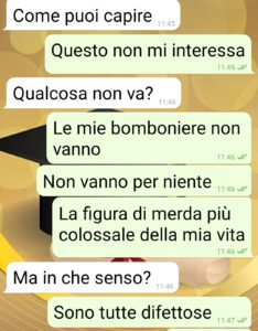 “Le bomboniere per la mia laurea sono difettose, a dir poco. E chi me le ha vendute… pure! Nel cervello è difettosa!