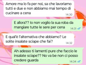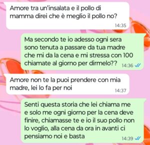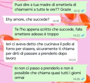 “Ciao Spunte Blu, oggi sono qui a raccontarvi la mia storia piuttosto assurda. Da pochi mesi a questa parte sono andata a convivere con il mio compagno e tra noi di base va tutto bene, così come andava bene anche quando non convivevamo. L’unico nostro grande problema però è la madre del mio compagno che non perde occasione per stalkerarmi ogni giorno con chiamate inutili e sopratutto indesiderate. Leggete pure la chat che ho mandato e comprenderete all’istante quale sia la nostra situazione in casa, un problema che adesso per me sta davvero diventando insostenibile”