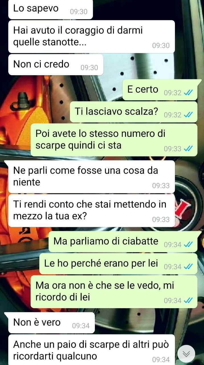 Per me si poteva chiudere lì l’argomento e io, vi giuro, ancora adesso ho qualche dubbio sul perché abbiamo litigato. Mi è chiaro il suo punto di vista, però mi chiedo se sia valido. Mi spiego meglio, se a lei dà fastidio una cosa che a me non fa né caldo e né freddo, per quale motivo deve prendersela così tanto? Non si fida forse di me?