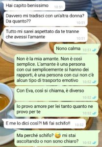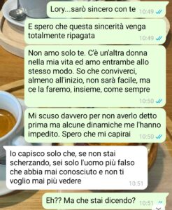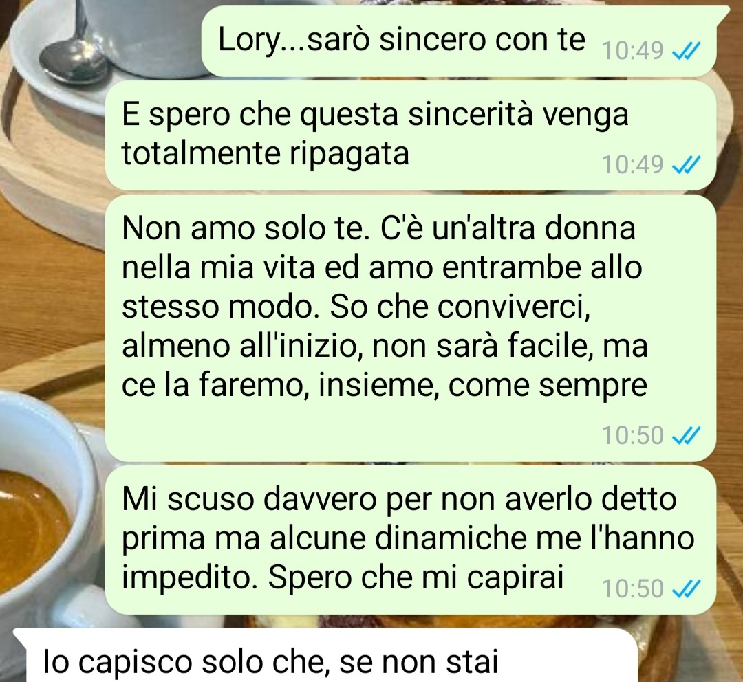 “A mio rischio e pericolo, perché purtroppo lo so che molto spesso, troppo spesso, chi legge e commenta su internet lo fa con superficialità, senza ascoltare davvero le ragioni degli interessati, ho deciso di rendere pubblica, in forma anonima, questa mia conversazione con Lorenza. Lorenza è una donna che amo. Su questo non ci sono dubbi. Perché Lorenza è tutta la mia vita. Da quando l’ho conosciuta, alcuni anni fa, tutto il mio modo di vivere è cambiato. Lei mi rende felice, è energica, è cocciuta ma nel senso che lotta e combatte per quello che crede. Lei è selvaggia, da quello sprint alla mia vita di cui ho sempre sentito il bisogno. Lei è ciò che ho sempre voluto. E la amo. La amo davvero, non ci sono dubbi. Il vero problema, che problema non è ma è sicuramente per questo motivo che è nata questa conversazione ed è anche per questo che sono qui oggi, è che non è l’unica donna che amo. Parlo sinceramente, senza giri di parole, senza mezzi termini: amo Lorenza alla follia ma amo allo stesso modo anche un’altra donna.”