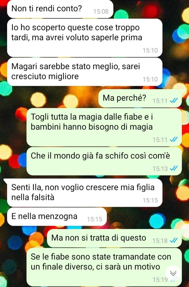 “Ciao Spunteblu e ciao a tutti i vostri lettori! Mi chiamo Ilaria e ho avuto una terribile discussione con il mio compagno, Alberto. Io e lui aspettiamo la nostra prima figlia, è tutto meraviglioso, proprio come lo avevo immaginato, tranne per una cosa. La discussione è su un particolare modo di educare nostra figlia, ma dovremmo essere tutti e due d’accordo su questo punto, altrimenti dove andiamo? No? Ovviamente io sono quella romantica della coppia, quella che crede alla magia delle cose, Alberto è molto più realista, a volte lo prendo in giro e lo chiama “distruggi-sogni”. Stavolta però è diverso, perché c’entra nostra figlia, e non può imporre le sue idee, giusto? Io sono la madre e penso di avere un po’ più di ragione in questo campo, correggetemi se sbaglio!