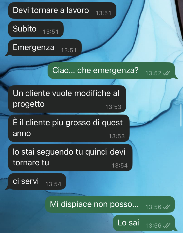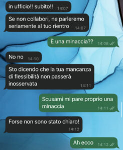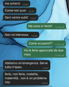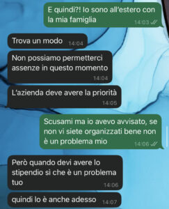 Non voglio anticiparvi troppo: leggete la conversazione e ditemi se secondo voi è normale essere trattati così. Forse è vero che anziché stare al mare sarei dovuto andare al referendum a votare per i diritti dei lavoratori… adesso non so più che fare. Però mai farsi mettere i piedi in testa! A costo di perdere il lavoro!
