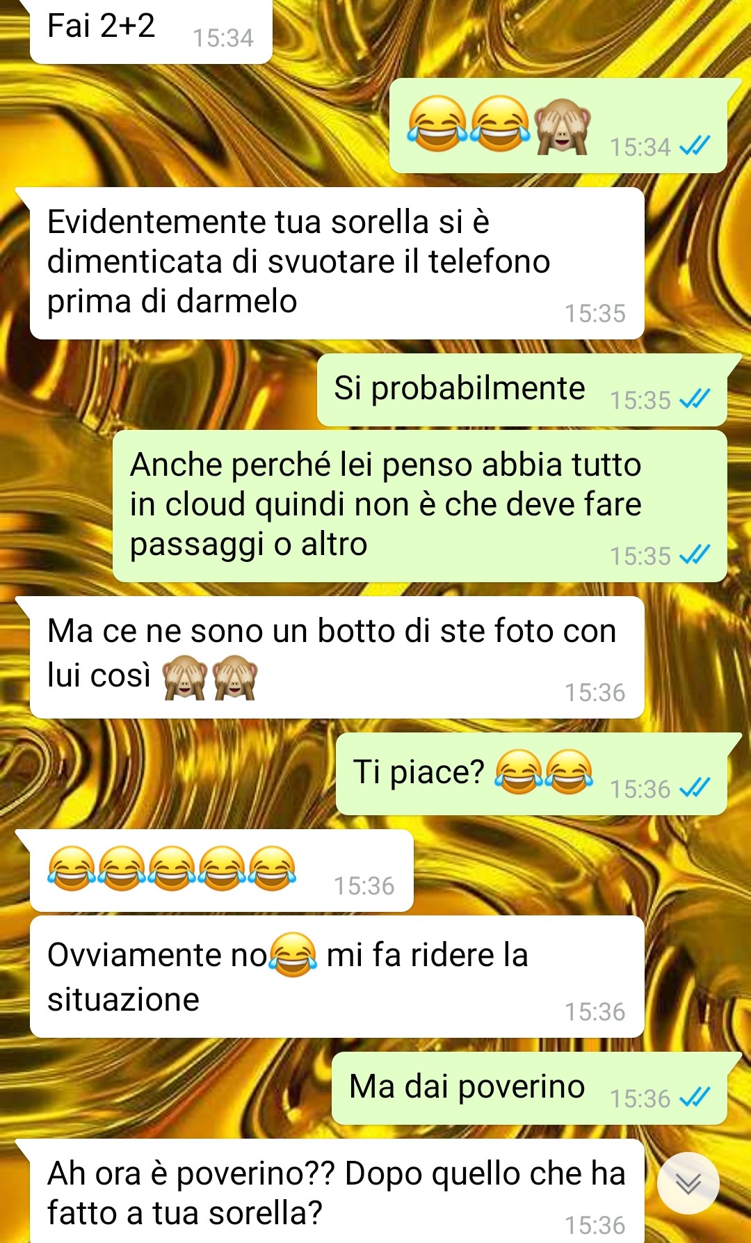 Il problema è che lei, penso perché aveva tutto anche in cloud, ha dimenticato di cancellare il contenuto che ora è ancora nel telefono nelle mani del mio ragazzo. All’inizio la cosa poteva essere anche simpatica perché c’erano foto anche esilaranti da certi punti di vista ma poi lui mi ha detto di aver trovato anche molte ma molte foto decisamente intime di mia sorella.