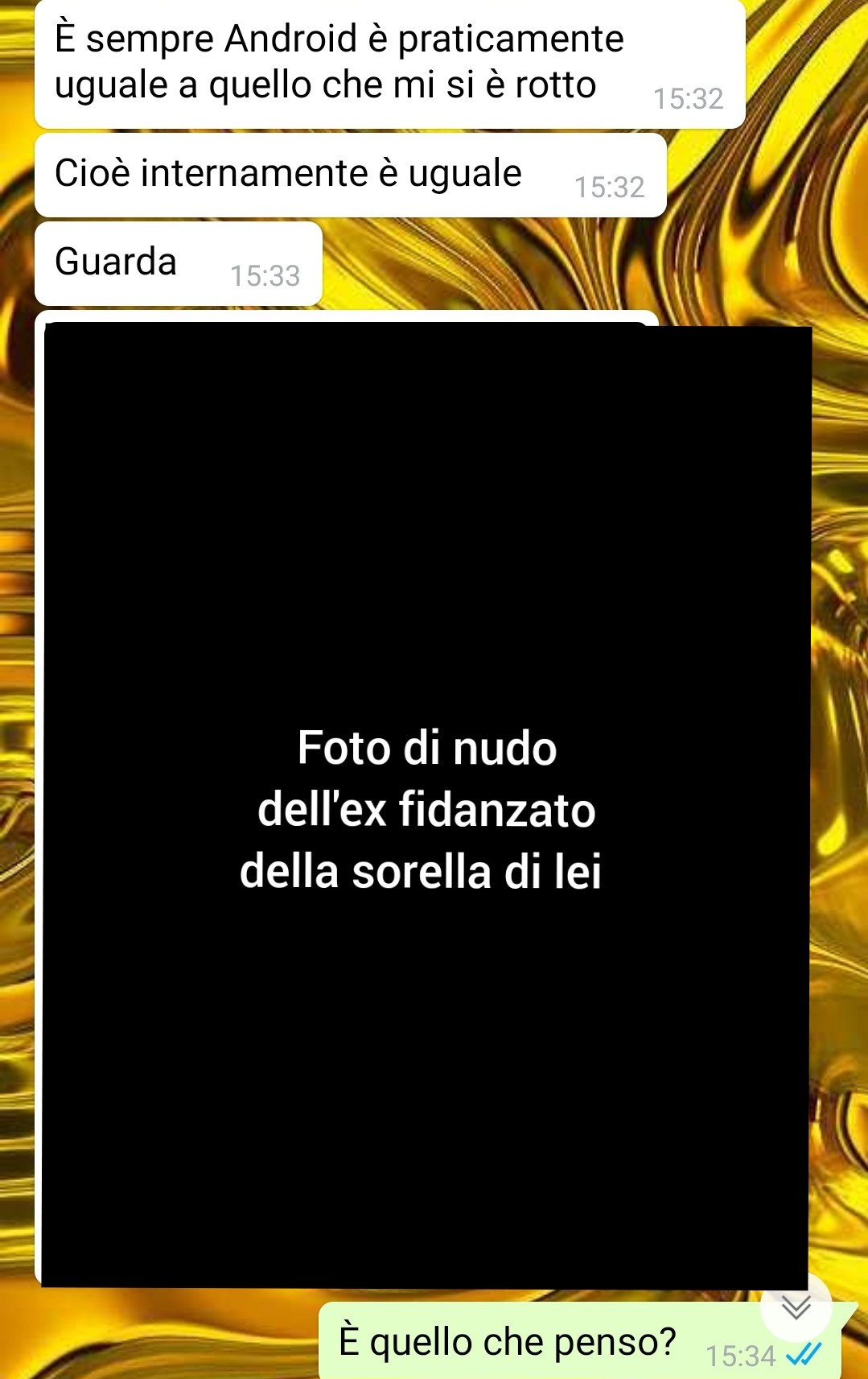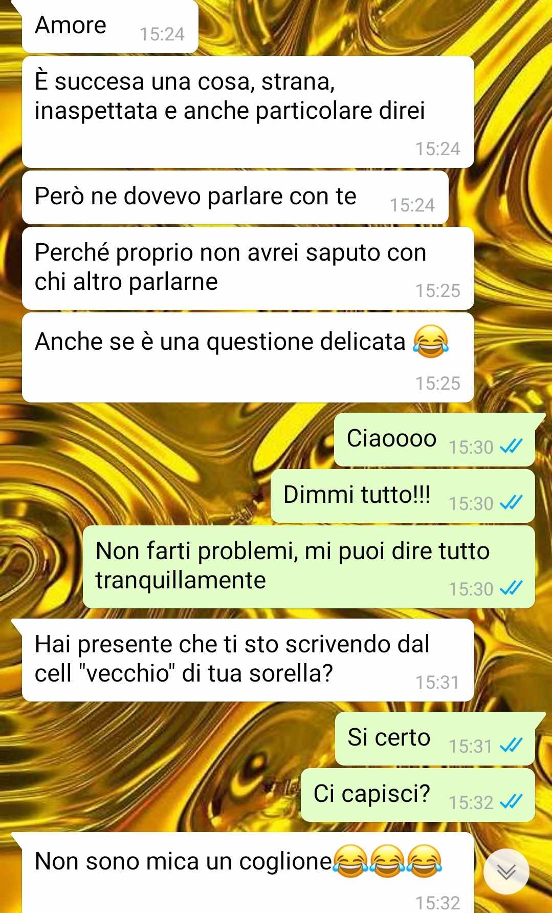 Il problema è che lei, penso perché aveva tutto anche in cloud, ha dimenticato di cancellare il contenuto che ora è ancora nel telefono nelle mani del mio ragazzo. All’inizio la cosa poteva essere anche simpatica perché c’erano foto anche esilaranti da certi punti di vista ma poi lui mi ha detto di aver trovato anche molte ma molte foto decisamente intime di mia sorella.