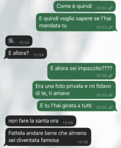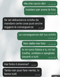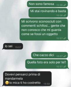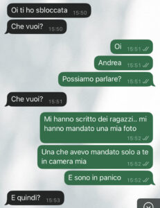 “Ciao community di spunte blu, sono di nuovo io, la ragazza protagonista delle foto che sono state diffuse in vari gruppi online senza il mio consenso da parte del mio ex. Volevo aggiornarvi sulla situazione e ringraziarvi per il supporto che mi avete dato nei commenti che ho letto. Andrea alla fine mi ha sbloccata su whatsapp e ci ho parlato, e proprio questa è la conversazione che voglio farvi leggere. Ditemi voi se è possibile nel 2025. Mi sono sentita sporca, in imbarazzo, sbagliata, ma ho capito che bisogna agire in queste circostanze e non farsi mangiare dagli uomini che pensano di poter fare quello che vogliono. Andrea ha avuto il coraggio di dire delle cose che mai mi sarei immaginata da lui, ma credo che le cose stiano cambiando. Infatti anche io ho fatto qualcosa che mai mi sarei immaginata di fare. Vorrei che queste cose non accadessero più. Ora vi faccio leggere quello che mi ha scritto il mio ex Andrea per farvi capire meglio la situazione… mi vergogno anche di essere stata con uno come lui…