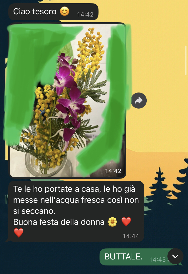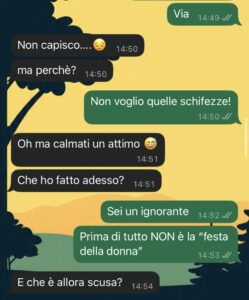 Sì, proprio così. Rifiutarle!! A tal proposito voglio condividere con voi cosa mi è successo con il mio compagno, che racconta bene la società in cui viviamo. Lui l’8 marzo mi ha portato le mimose ed era tutto tronfio e felice, ma questa volta no. Io ho detto basta. Finalmente, per la prima volta, ho sbroccato e sono stata felice di farlo!!