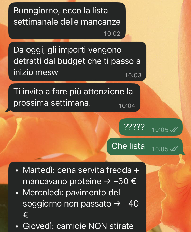Ultimamente però lui ha iniziato a comportarsi in modo… strano. Direi quasi da capo-ufficio, più che da marito. Non so se sia stress, non so se sia cambiato qualcosa dentro di lui, ma il modo in cui mi parla e soprattutto il modo in cui mi “conta le cose” mi fa sentire umiliata. Non più moglie, non più compagna di vita, ma solo qualcuno che deve rispettare regole assurde.