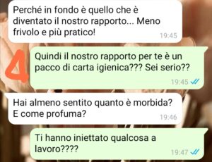 Ma lui ci teneva ad anticipare un po’ i festeggiamenti…così, io rientro dal lavoro la sera, lui era appena andato via…mi chiama e mi dice che al mio rientro troverò una sorpresa speciale. Io sono emozionatissima… chissà cosa sarà, mi dico…mi faccio mille idee ma quando arrivo in casa ecco diciamo che scopro di non essermi avvicinata a nessuna di quelle… leggete il primo screen e poi tutta la storia, grazie e scoprirete anche voi cosa ho ricevuto “