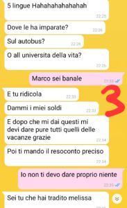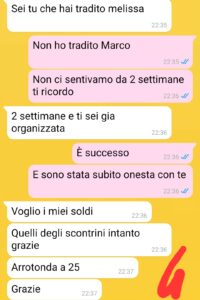 “Ciao a tutte le follower e i follower di spunteblu, mi chiamo Melissa e ho appena lasciato Marco. Sono stata insieme a lui per diversi anni, con vari tira e molla annessi. La nostra storia è stata una classica relazione tossica. Amore e odio. Tante pause, silenzi e poi periodi che sembravano idilliaci. Adesso me ne sono liberata. L’ho fatto perché una persona speciale che ho conosciuto mi ha fatto vedere il mondo diversamente e mi ha aiutato a trovare il coraggio di lasciare Marco. Non ce la facevo più. Il problema peró è che adesso, lui e anche sua madre, non vogliono lasciarmi in pace. Vogliono che io mi senta in colpa e che dia indietro soldi e cose che mi hanno regalato. Soprattutto una cosa: una collana di perle. Prima mi ha scritto Marco per rompere e chiedere soldi…poi mi ha scritto sua madre. Non avevo mai sentito la madre di Marco su whatsapp, e lei, dopo anni che mi conosce, ha deciso di scrivermi solo adesso e solo per interesse.”