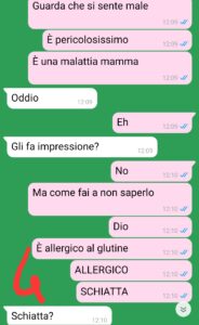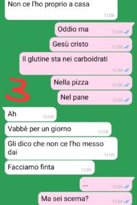 “53 anni di vita e mia madre non sa ancora che cosa vuol dire la parola “CELIACO”. Ciao, mi chiamo Elena, ho 27 anni e da qualche mese ho iniziato a frequentare Alberto dopo 2 anni passati da single. Dopo mesi di uscite è arrivato il fatidico momento della presentazione alla famiglia e ho detto a mia madre che lo avrei portato a pranzo a casa. Le ho specificato più volte che Alberto è celiaco, certa che lei comprendesse il significato del termine. Purtroppo, però, ho sottovalutato questo aspetto e a mezz’ora circa dal pranzo ho scoperto che mia madre aveva fatto un pranzo completamente a base di glutine. Errore mio? forse. Ma come posso pensare che alla sua età non sappia nemmeno cosa sia il glutine? sono anni che fa pizze, pizzette, panini, torte. Io sono sconcertata. Per fortuna Alberto ha capito la situazione…pero che figuraccia ragazzi mi volevo sotterrare. Con i genitori ci vuole pazienza…”