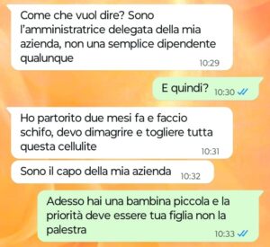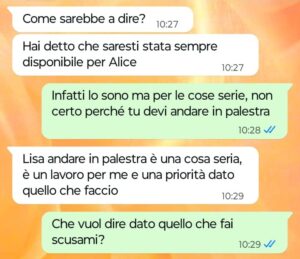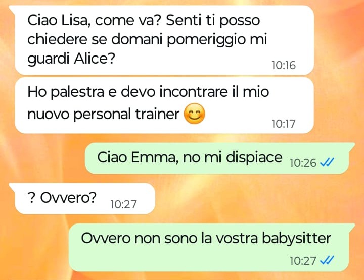 “Buongiorno Spunte Blu, innanzitutto mi presento, mi chiamo Lisa e sono una donna sola. Sola perché i miei figli sono già belli cresciuti e hanno le loro rispettive famiglie e il mio amato marito due anni fa è venuto a mancare. Per fortuna comunque ho un bel rapporto con entrambi i miei figli e non mi posso lamentare. Ad oggi ho solo un problema in verità e il mio problema si chiama Emma, ossia la moglie di mio figlio Giulio. Emma ha un carattere molto forte, come il mio, e spesso e volentieri ci scontriamo anche per le cose più banali. Lei e mio figlio due mesi fa hanno avuto una splendida bambina e nell’arco di questi due mesi io li ho già aiutati più di una volta a tenere la bambina quando entrambi erano impegnati. Purtroppo però ho capito che di questa mia disponibilità Emma se ne vorrebbe approfittare più del dovuto e infatti poco fa mi ha scritto per chiedermi di tenerle la piccola Alice domani pomeriggio per una cosa che deve fare. Adesso io ho dato loro la mia disponibilità per tenere la piccola solo nel caso in cui entrambi fossero impegnati a fare cose serie e non sciocchezze, come quella che Emma vuole fare domani. Insomma, penso che sia arrivato il momento che lei metta la testa a posto ed impari da sola a fare il genitore senza la mia assistenza costante, assistenza che ripeto ho deciso di non concederle più sopratutto quando si tratta davvero di cretinate.”