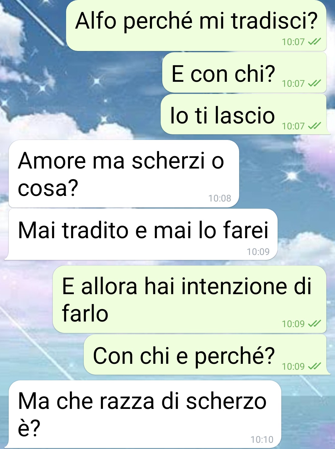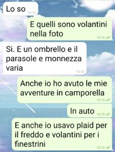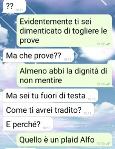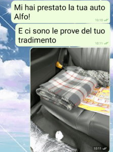 Alfonso è il mio fidanzato da 3 anni e lo dicevo che era troppo perfetto per essere vero. Infatti ho scoperto che mi tradisce. Non può che essere così. Vi spiego perché. Lui accompagna la madre a fare terapie in ospedale 3 giorni ogni mese, ha la 104. E io capita random di dover andare abbastanza lontano col corso che frequento. Del mio macinino non mi fido che perde olio e acqua e allora lui mi presta la sua. E se nello stesso giorno deve accompagnare la madre usa la panda dei suoi e mi lascia la sua macchina la sera prima sotto casa. Ed è quello che è successo oggi in pratica. Ma come salgo in auto trovo lampanti le prove del tradimento, chiaro che ha dimenticato ieri di ripulire il luogo del delitto. Gli ho scritto subito e ha pronte le giustificazioni. Ma dai mi devo bere ste scuse? Tutte assieme? Voi lo fareste?”