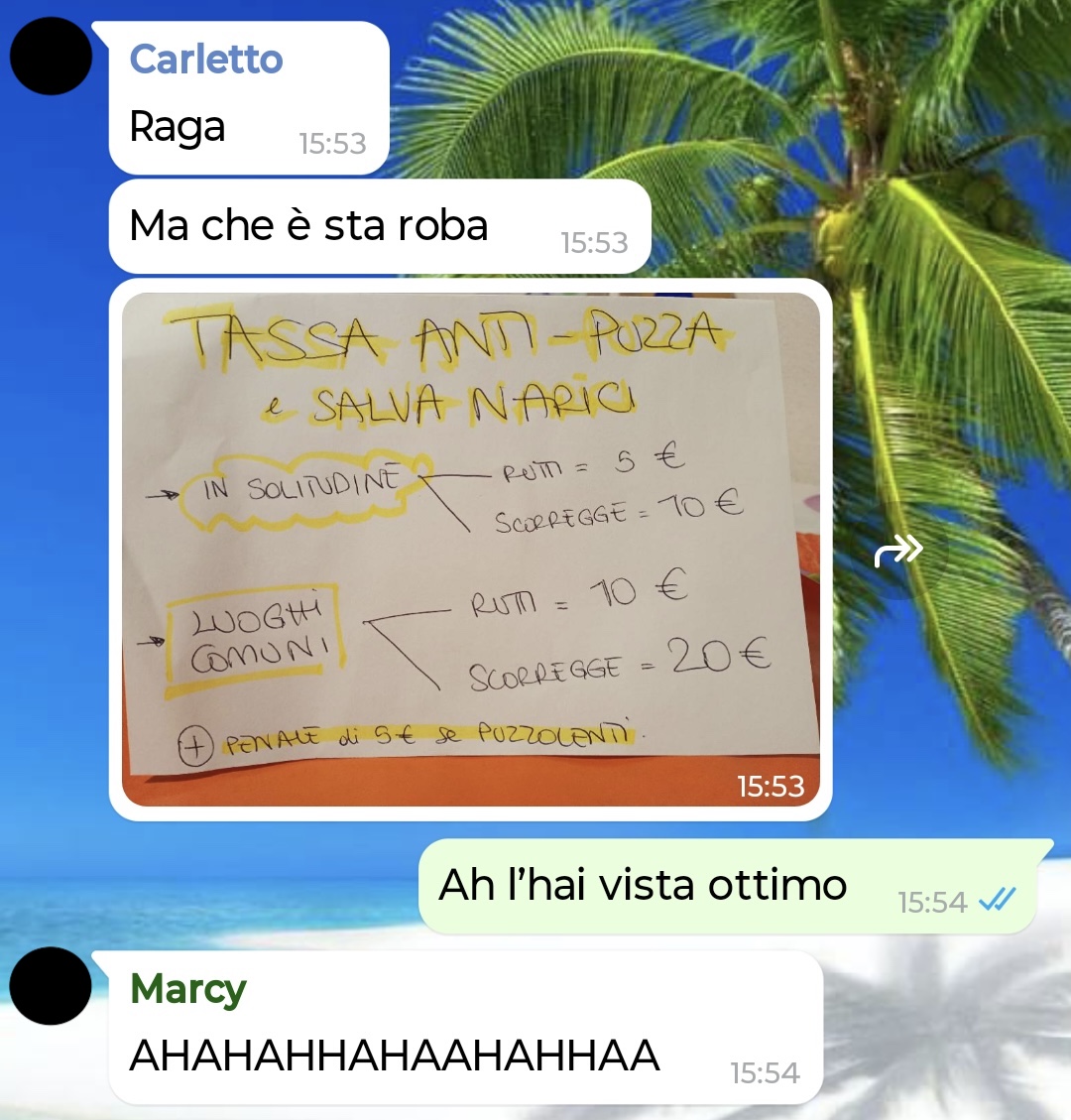 Ho deciso che d’ora in poi in casa mia chiunque faccia rutti o peggio, oppure nel caso della femmina, lasci il bagno in condizioni pietose, dovrà pagare una tassa.