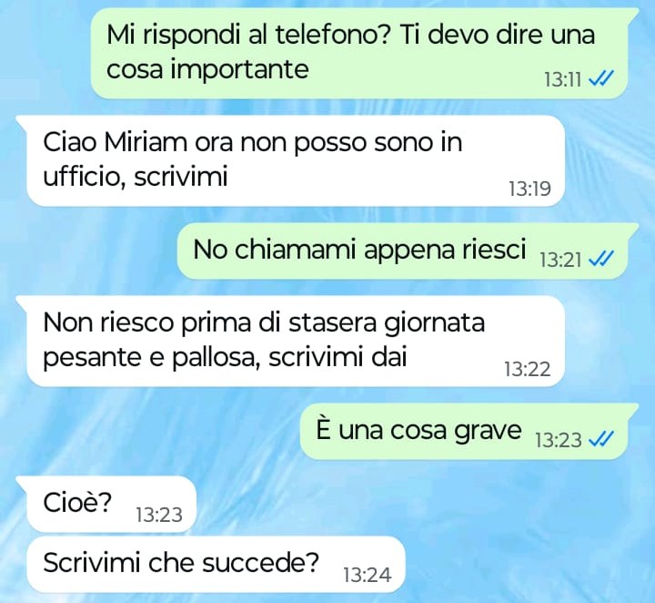 “Ciao Spunte Blu la chat che vi voglio mandare oggi è qualcosa di paradossale una roba da non credere. Mi chiamo Miriam e sono molto legata a una mia cara amica d’infanzia con cui sono cresciuta insieme. Oggi è successa una cosa gravissima e molto brutta che coinvolge direttamente questa mia amica e così appena ne sono venuta a conoscenza l’ho subito contatta per comunicare l’evento a cui mi è capitato di assistere in prima persona. Adesso per favore leggete le risposte della mia amica a quello che le ho comunicato e ditemi se è normale una reazione del genere come la sua… dove ho sbagliato io personalmente in questa nostra discussione? No ditemelo voi perché io non lo comprendo più…”