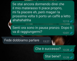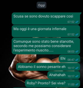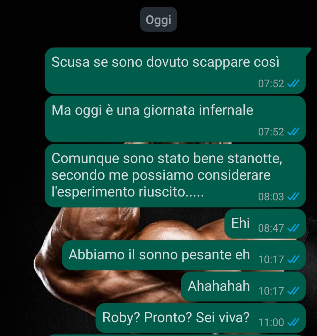 “C’era una volta un ragazzo che fatica a trovare una ragazza normale. Ciao a tutti, volevo raccontarvi di questa faccenda. Io e Roberta ci siamo conosciuti in palestra. Lei mi aveva approcciato con la scusa di chiedermi consigli su un esercizio per le braccia, e siccome ho abbastanza esperienza l’ho aiutata. Lei si è un po’ stranita poi mi ha spiegato che potevo cercarla su Instagram. Così ci potevamo tenere in contatto. A me ha fatto piacere. Poi abbiamo iniziato a uscire. Mi ha fatto tenerezza perché mi ha raccontato subito di due storie che ha avuto, una peggiore dell’altra, per cui ha avuto molti problemi a fidarsi. E io le ho detto che pure io ho avuto problemi a fidarmi proprio per esperienze brutte che ho avuto in passato, e proprio per riprendermi avevo iniziato a fare palestra. C’era un problema. Roberta non voleva dormire mai da me. A qualsiasi ora ci vedevamo, lei prendeva e doveva tornare a casa sua, cascasse il mondo non poteva dormire da me. Dopo qualche mese alla fine l’ho convinta. Lo abbiamo chiamato “l’esperimento del materasso”. E secondo me ho fatto male. Quello che è successo dopo lo potete leggere qui nella chat che invio.”