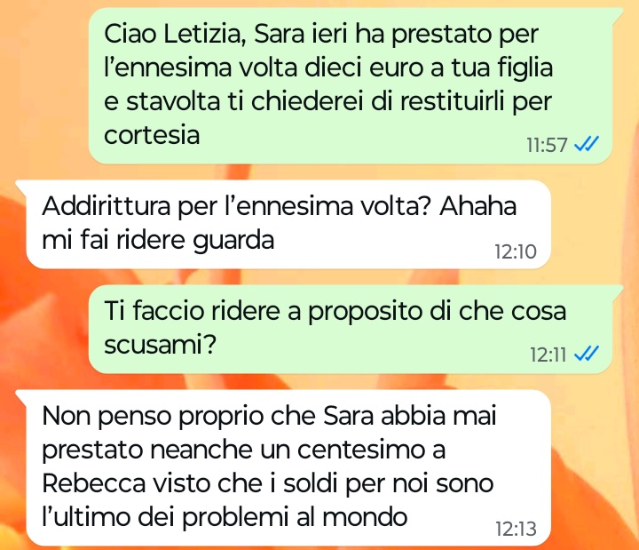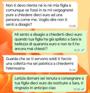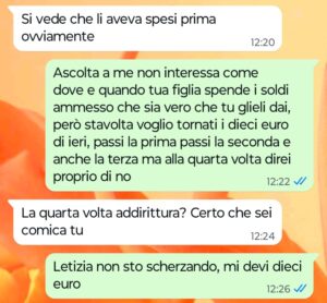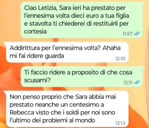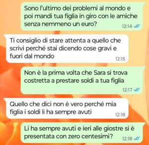 “Ciao Spunte Blu, siete pronti a leggere qualcosa di veramente incredibile? Sono la mamma di una ragazzina sveglia e vispa che si chiama Sara. Mia figlia non ha mai avuto problemi a farsi nuove amicizie, anzi io dico sempre che è fin troppo socievole. Ultimamente ha legato con una ragazzina che non mi piace per niente, una di quelle piccole snob che per colpa dei genitori credono di avere già il mondo in mano. Vi sarà sufficiente leggere la mia chat di poco fa con la mamma di questa ragazzina per comprendere subito a che tipo di specie aliena e arrogante appartiene certa gente…”