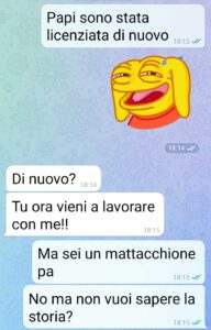 Sono stata licenziata INGIUSTAMENTE (!!!!!!!!!) e ho raccontato a mio padre come è andata, ma lui non mi crede assolutamente. Voi a chi credete?? Vi mando la chat per dimostrare a mio padre che quello che dico è vero o non mi avrei mai mandato la chat!!”