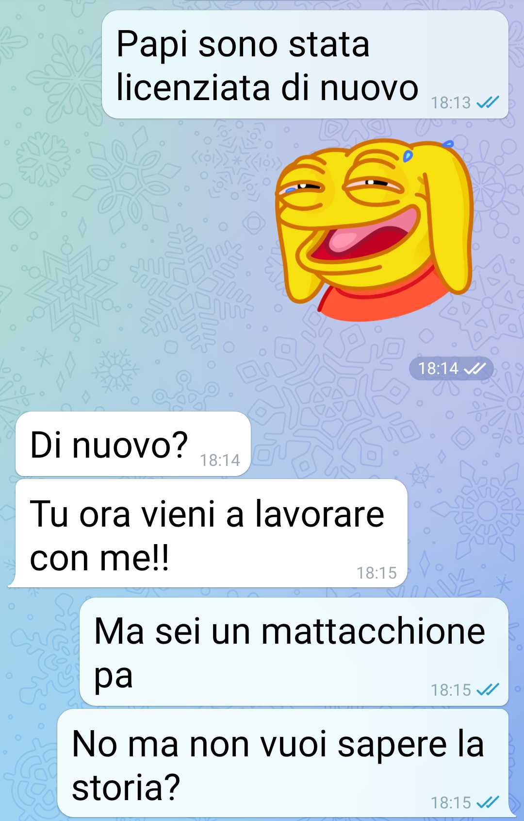 Sono stata licenziata INGIUSTAMENTE (!!!!!!!!!) e ho raccontato a mio padre come è andata, ma lui non mi crede assolutamente. Voi a chi credete?? Vi mando la chat per dimostrare a mio padre che quello che dico è vero o non mi avrei mai mandato la chat!!”