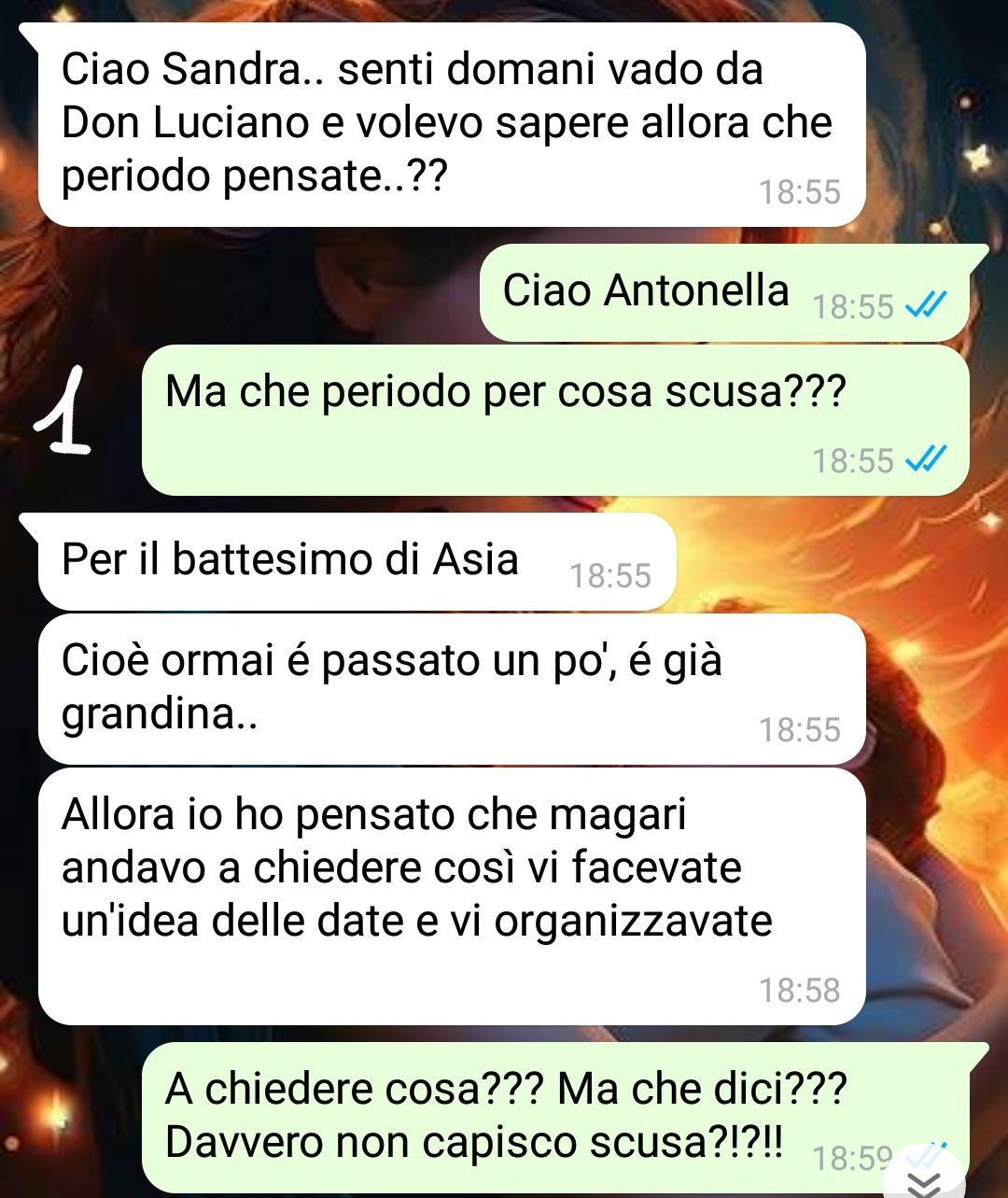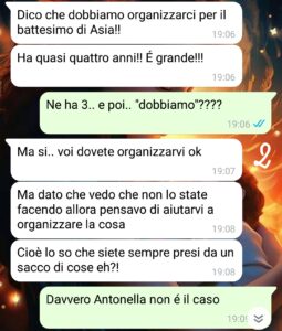 “Ciao SpunteBlu, mi chiamo Sandra: io e il mio compagno Lorenzo abbiamo una bambina di tre anni che si chiama Asia. Sono molto felice della mia famiglia e devo dire che il rapporto con il mio compagno è addirittura migliorato dopo che siamo diventati genitori.. e meno male!! Molte mie amiche sono andate in crisi con il marito/compagno dopo la nascita dei figli.. Il rapporto che invece sta andando deteriorandosi dopo la nascita di Asia, o se vogliamo, in seguito alla nascita di Asia, è quello con la mamma di Lorenzo Antonella. Dovete sapere che Antonella ha un carattere particolare: da un lato non vuole essere troppo coinvolta nella vita di sua nipote Asia (chiederle di tenerla un pomeriggio è davvero difficile, fa sempre un sacco di storie!!), dall’altra a volte ci sono cose su cui si impunta e sembra quasi che sia un suo diritto decidere!! Poco prima che nascesse Asia avevamo già avuto una discussione – il primo scontro serio – sul fatto che io e Lorenzo avevamo deciso di non sposarci: alla fine Lorenzo ci ha litigato e la cosa è finita così.. adesso improvvisamente Antonella si è ricordata che Asia non è stata battezzata..”