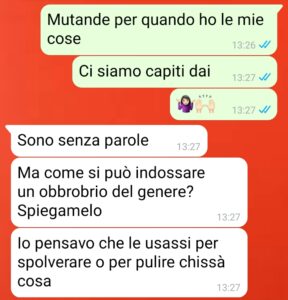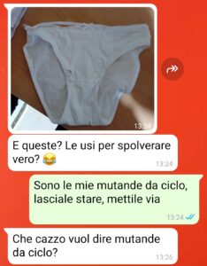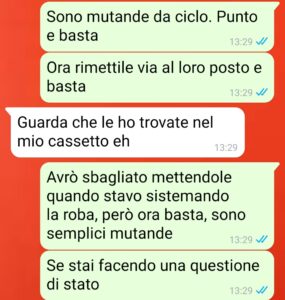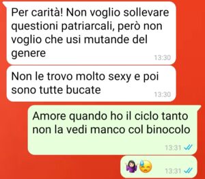 “Ciao, mi chiamo Luana e sono fidanzata con Mirko da qualche anno. Lui è il classico uomo molto maschio con dei canoni ben imposti, quindi gli ho sempre nascosto le mie mutande da ciclo per paura che potesse trovarle. Invece un bel giorno le ha trovate ed è successo il finimondo. Quindi eccomi qui a chiedervi un consiglio: voi donne/ragazze usate le mutande da ciclo? È normale usarle no? Perché gli uomini devono essere sempre così critici con noi.. io non credo di aver fatto niente di sbagliato, ok che bisogna essere sempre belle e curate, ma CHE PALLE!!”