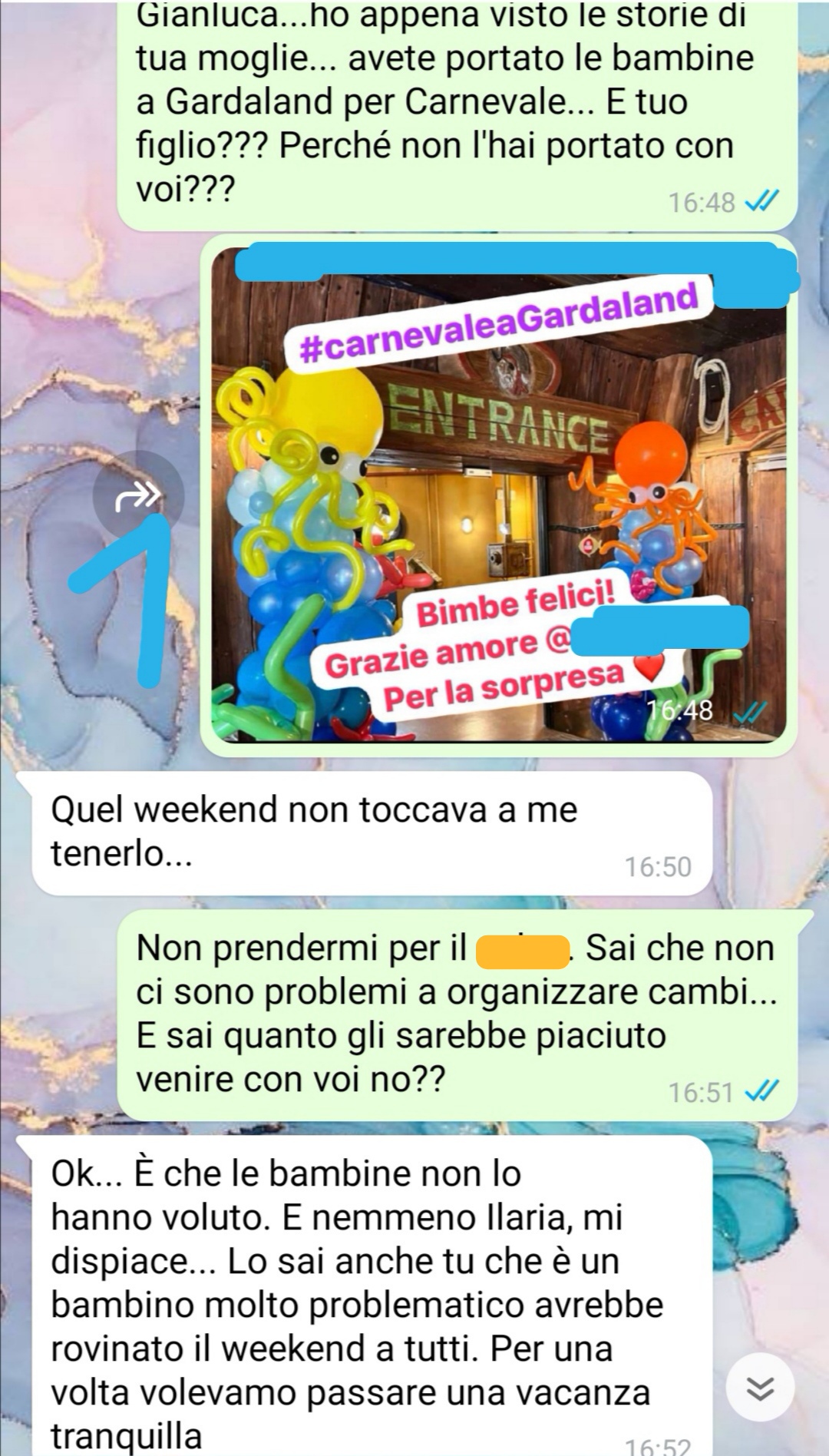 Io e il mio ex abbiamo in comune un figlio, Vittorio, che ha  7 anni. Noi ci siamo separati quando ne aveva 2. Dopo poco lui ha conosciuto la sua attuale compagna e hanno avuto due bambine che hanno 3 e 4 anni.