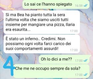 E io ci tengo molto che ne faccia parte…ma come vi dicevo, l’altro giorno, attraverso le stories whatsapp vengo a sapere una cosa che mi spezza il cuore…e da lì è un’escalation…vi mando tutti gli screen perché io ho quasi preso una decisione difficile ma doverosa…ho bisogno però di pareri esterni, magari dí qualcuno che ci sta passando come me…secondo voi faccio bene?”